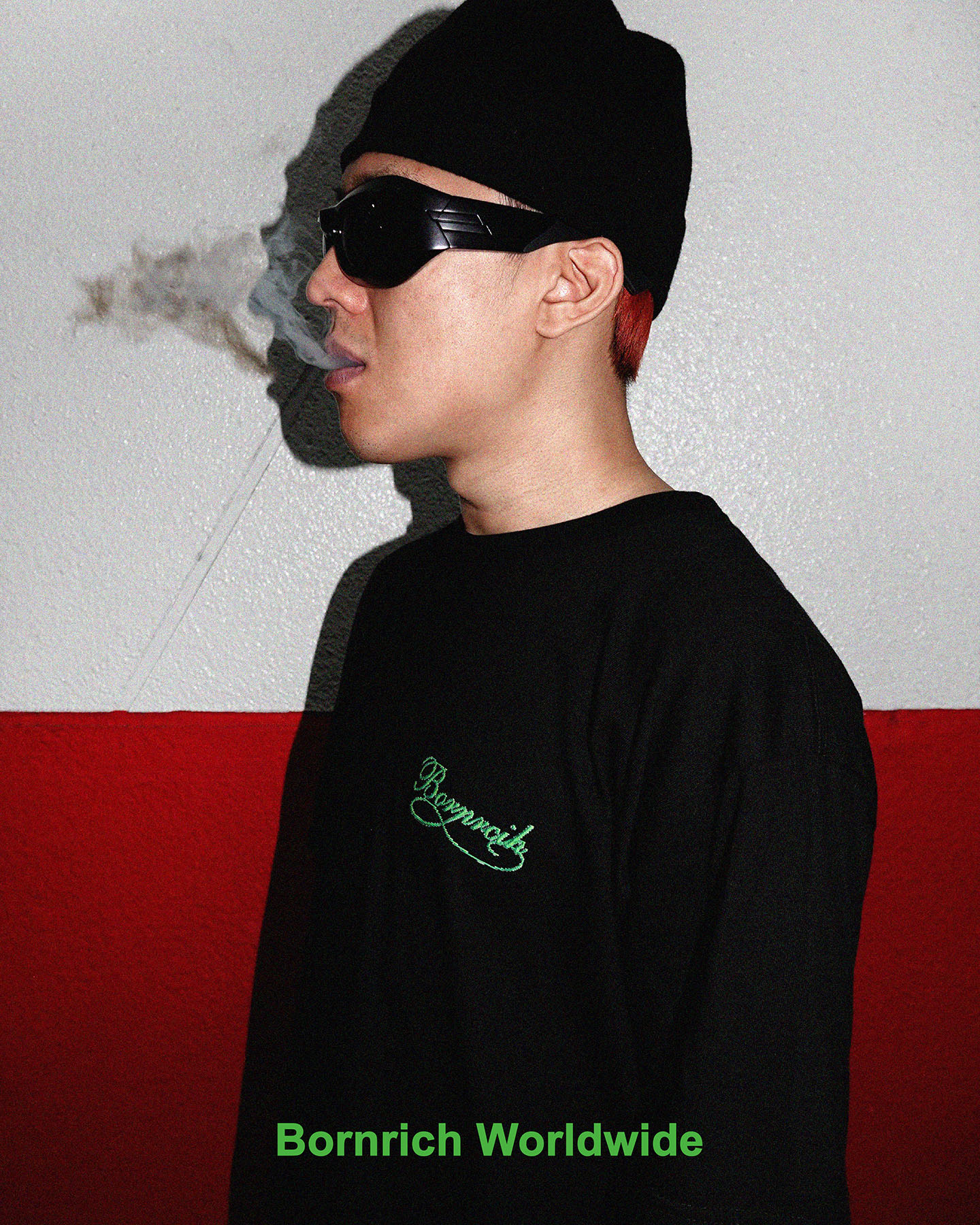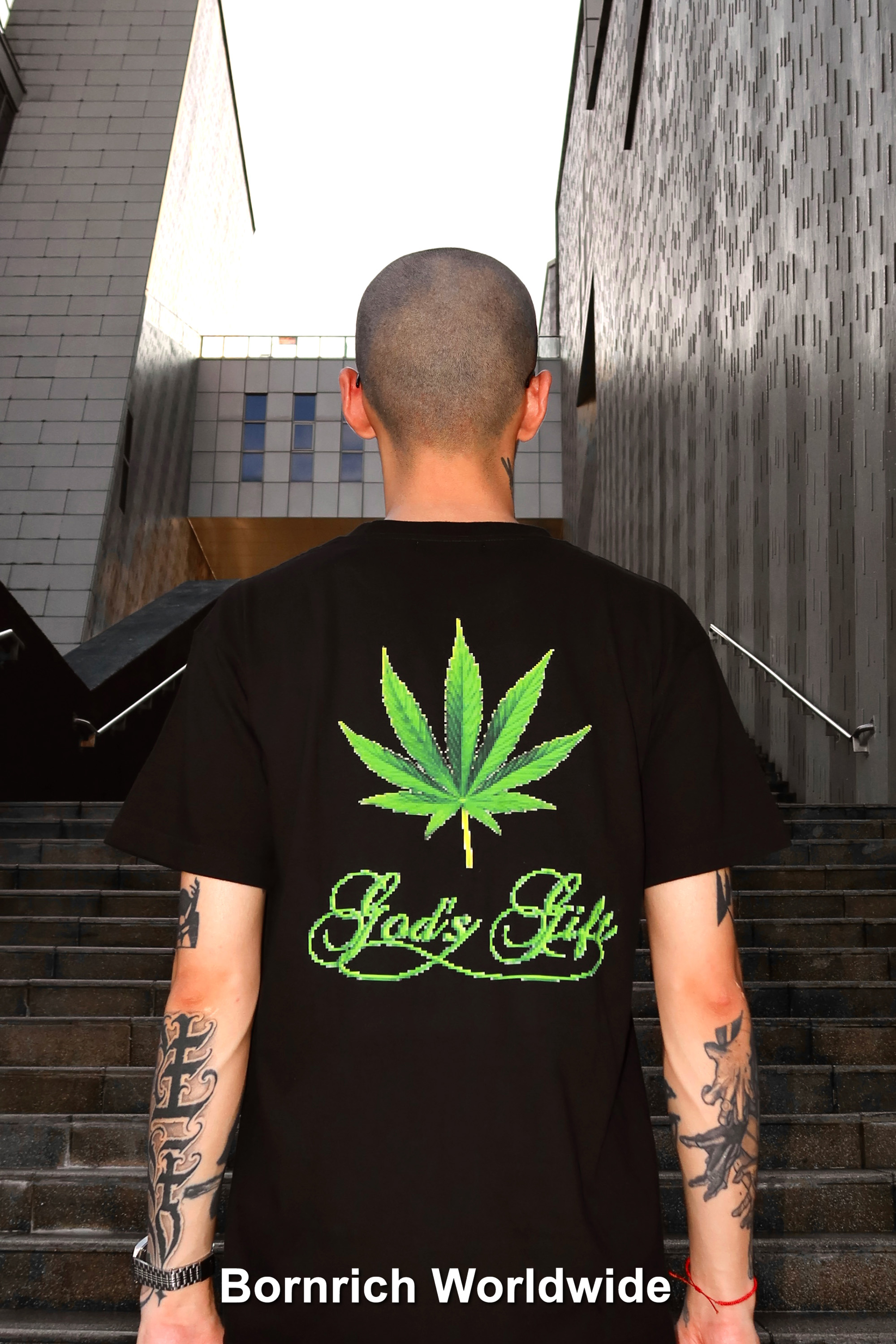 - PIXELATED BORNRICH LOGO ON THE FRONT AND CANNABIS LEAF ON THE BACK